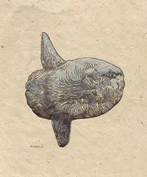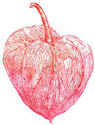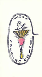 手彫りゴム版画、インク、色鉛筆、紙